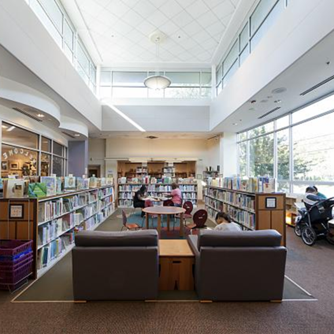 A nice modern library that has a great children’s selection and an outdoor playground!